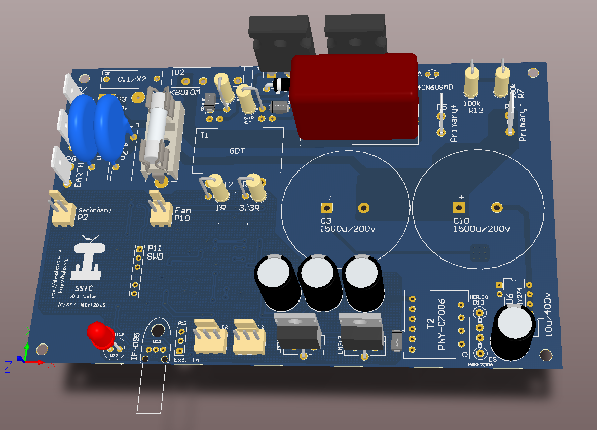 Фича заслуживает полноценной статейки на TQFP, однако вкратце я о ней расскажу и здесь. Как уже упоминалось — сделать хорошую SSTC далеко не проще DR'ки, причинами этому являются отсутствие стабилизирующего генерацию первичного контура, как следствие возможность взять с него ОС, и драйв первичной обмотки прямоугольным сигналом, состоящем из целой кучи гармоник.