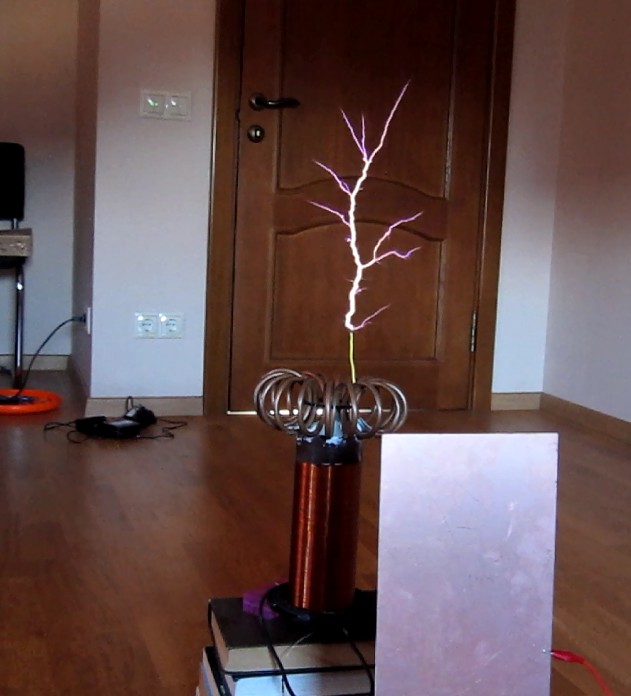 Итак, у нас новый запуск :) Затишье было связанно с тем, что все глючило и категорически отказывалось работать так, как нам хотелось. Конечно, просто разряды оно выдавало, но при ловле разрядов в землю, ПЛИС, из-за наводок, пропускала импульсы генератора и выдавала что попало. Сейчас проблему мы побороли и все работает, вроде-бы, хорошо. Сейчас этот сетап равномерно распределен по комнате: