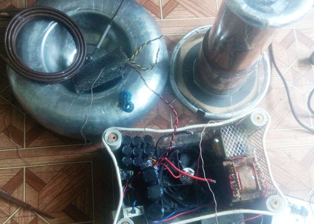Сейчас переделал первичку- теперь она двойная плоская с ксв около 0.19, спрак ринг тоже сделал. Чтобы отдалить поле контуров от сетки корпуса, сделал небольшое возвышение для первых. Укоротил вторичку- срезал лишнюю часть трубы, на которую при намотке оперались витки, а это около 1.5см с каждой стороны, сейчас осталось по миллиметру :D Еще добавил экран для gdt и уменьшил зазор между двумя торами(уменьшил от первоначального).Общая высота конструкции из-за добавления полочки для контуров и укорочения вв обмотки не изменилась- 60см(без терминала). Внешний вид, как по мне, немного лучше даже стал.