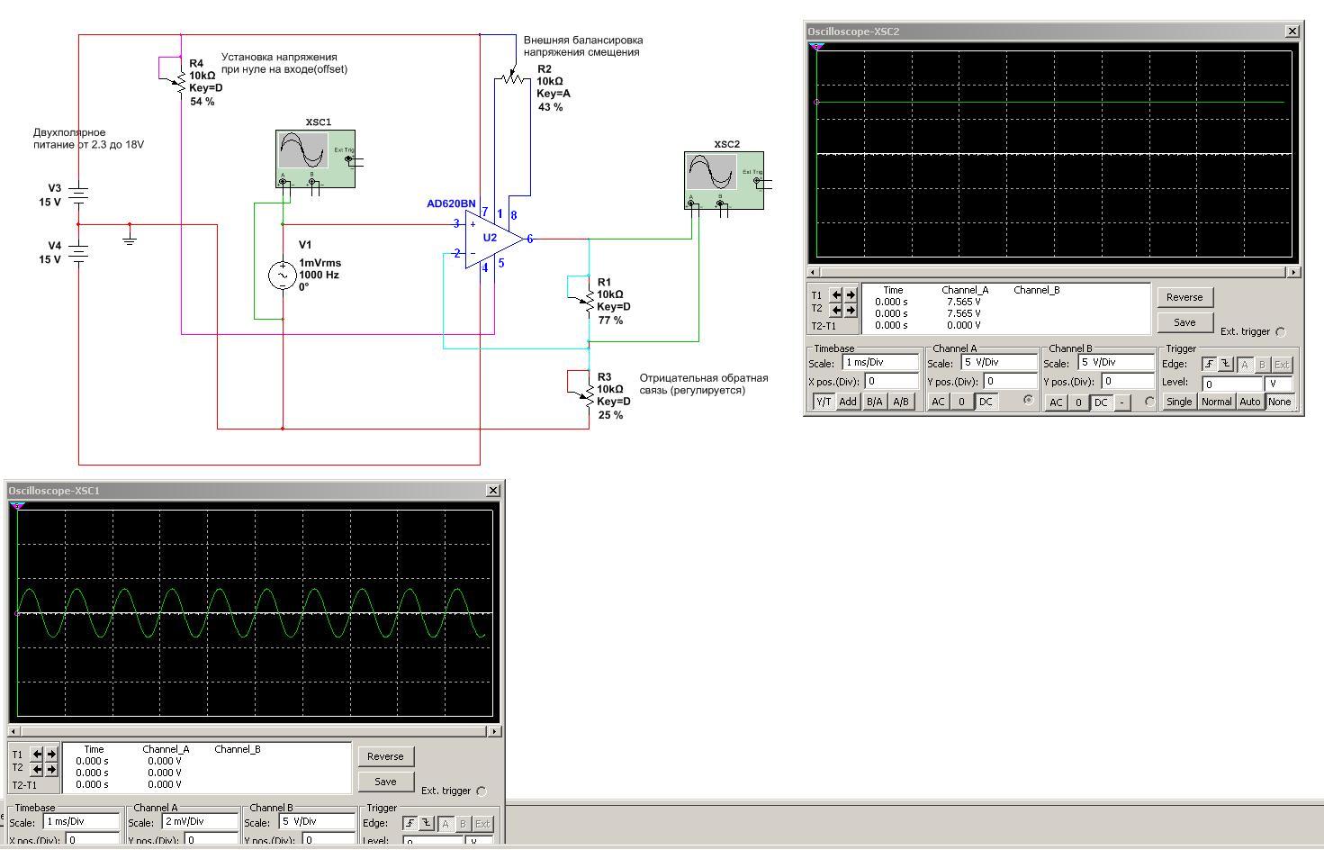 Всем привет! Добрался до операционных усилителей. Купил AD620. Как мне кажется, самый популярный среди прецизионных инструментальных. Бока подключать боязно. Попробовал смоделировать в Multisim12.0