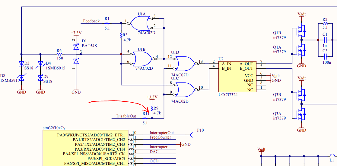 Резистор R11 по прежнему стоит заменить на 200 Ом, иначе ножка STM'ки уже будет поглощать мощный ток и снова может сгореть.