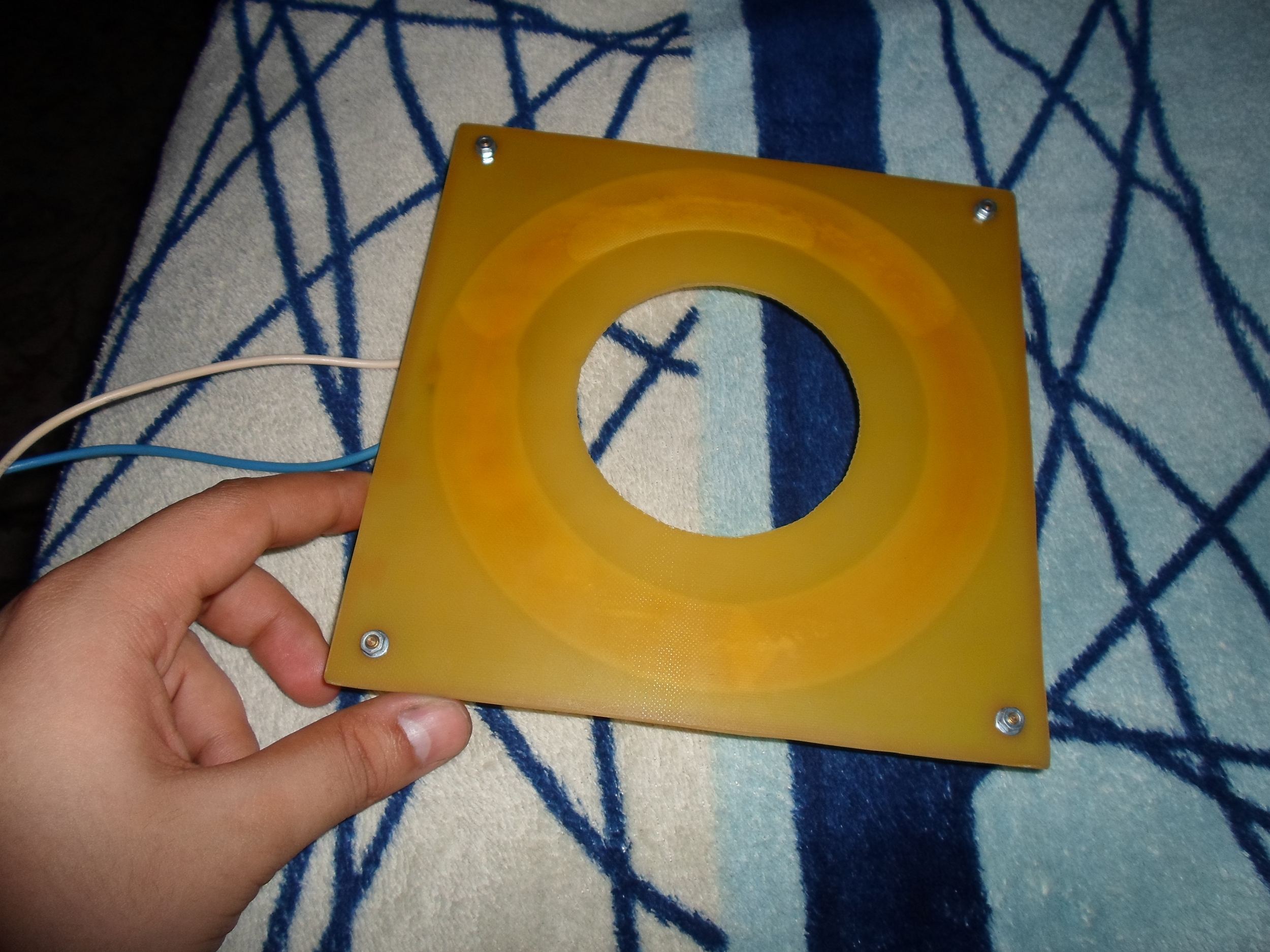 Демедж-репорт — припой расплавило и он начал капать на ковёр(запускалась низом вверх), после того как он стёк — медь покраснела и отслоилась от текстолита, заодно его немного поджарив. Насквозь.