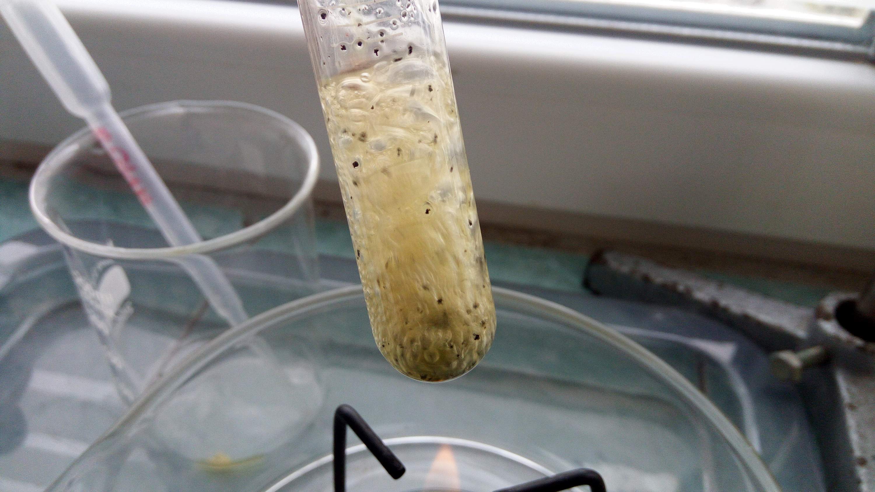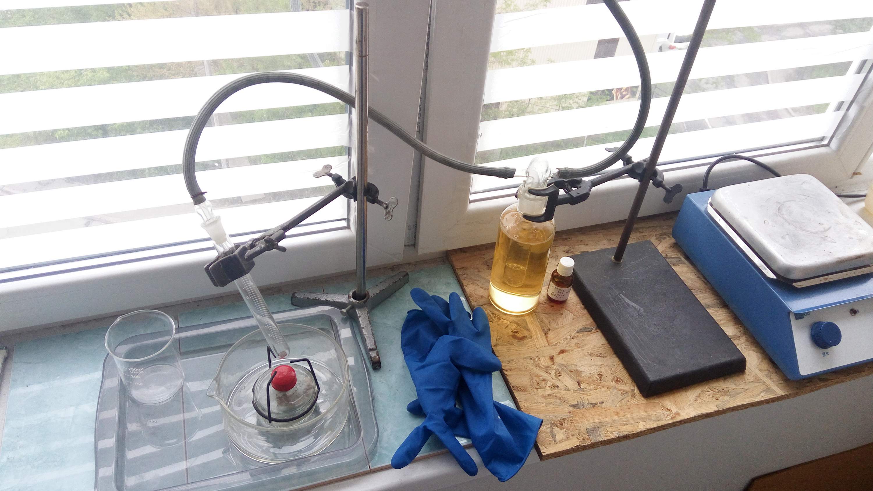 Конструкция не идеальная, ибо пары азотки разрушают шланг — над пробиркой должен был быть дефлегматор, но в процессе подготовки я на него сел.
