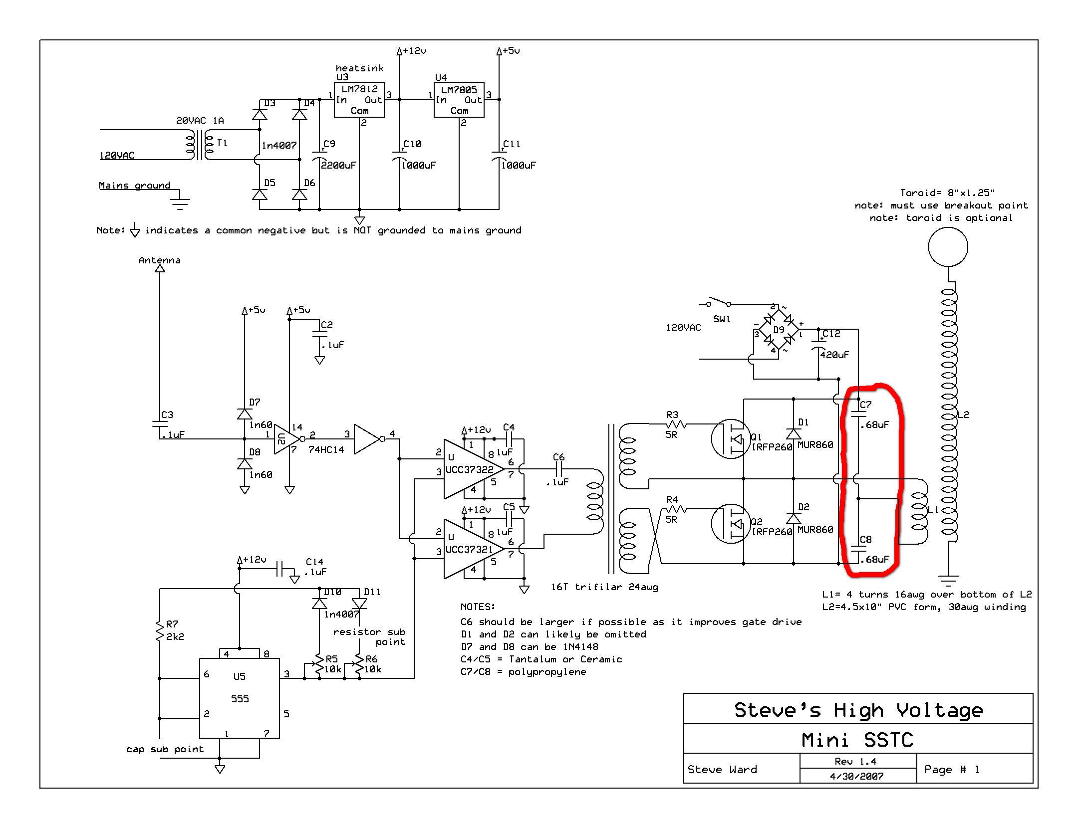Здравствуйте, форумчане!Недавно я решил собрать свою первую SSTC,(http://www.stevehv.4hv.org/SSTC5.htm последняя схема), я сравнительно новичок, и в процессе изучения разных материалов про SSTC возник ряд вопросв к этой схеме:перво-наперво хочу спросить почему на затворах транзисторов нету диодов для формирования дед-тайма, а есть только резисторы, надо ли они(диоды) там вообще? Второе что меня смутило это GDT, я смотрел статью BSVI (https://bsvi.me/raschet-i-primenenie-gdt/)про расчёт ГДТ, но не понял каких оно должно быть размеров (нашёл такое колечко но не знаю подойдёт ли http://www.rcscomponents.kiev.ua/produc ... E8%EA.html)? Третье что меня интересует - переделка девайса под 220В питания, для этого достаточно просто взять другие транзисторы "пожирнее", или управляющую часть надо тоже будет переделывать? Четвёртое это вторичный контур, обезательно ли делать именно такой как сделал Стив, а то у меня есть один небольшой 5х20см можно ли его использовать?Пятое--в схеме сказано, что С6 должен быть по-возможности больше, наскольно(1,2,3...10uF)?И последнее, в этой теме http://flyback.org.ru/viewtopic.php?t=2 ... sc&start=0