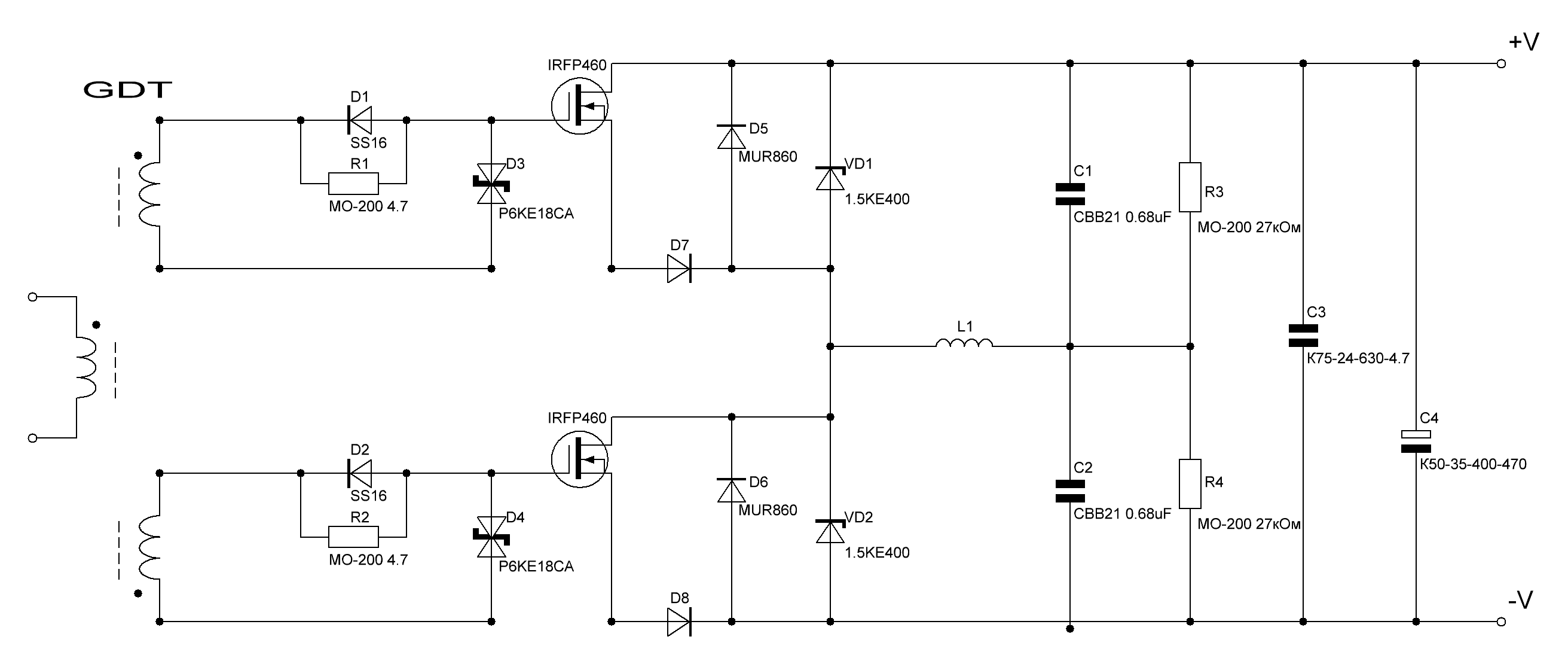 Транс ОС: берем такое же колечко как на GDT, делаем на нем 30-40 витков, пропускаем через него провод от вторички к земле, и все. То есть с обмотки кольца один выход на драйверы, а второй на землю? Как я понимаю D7 D8 С3 и С2 остаются, и исчезает только 74НС14? (Просто не могу понять для чего D7 и D8)