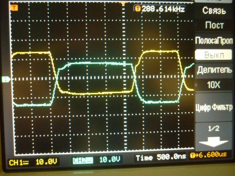 Предиктором более менее переключения в ноле добился. Силовая заметно меньше стала греться. Но то ли появился, то ли был такой звон при открытии ключа, но в общем вот. Эти колебания по частоте если округлить 29МГц (хоть резонатор цепляй и факельник делай). Начал искать как от них избавиться и откуда они берутся. Узнал, что они происходят в момент закртия другого ключа (а первый еще не открылся, получается в дедтайм как бы) и образуют LC контур состоящий из индуктивности первичной обмотки и проводов до силовой, межвитковой емкости и емкость между сток-истоком фета. И как бы если их подавить, то ключам становится легче переключаться, а это очень даже хорошо.
