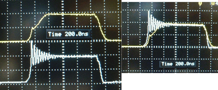 Результат очень порадовал. (Хоть BSVi и сказал что фронт лучше пологий, мне кажется вертикальный лучше все-таки) Фронт стал 5нс, звон есть, но он совсем небольшой. Да и спад по прямее стал. А на затворе вовсе пропал Миллер. Про нагрев силовой пока не скажу, включал не более 10сек.