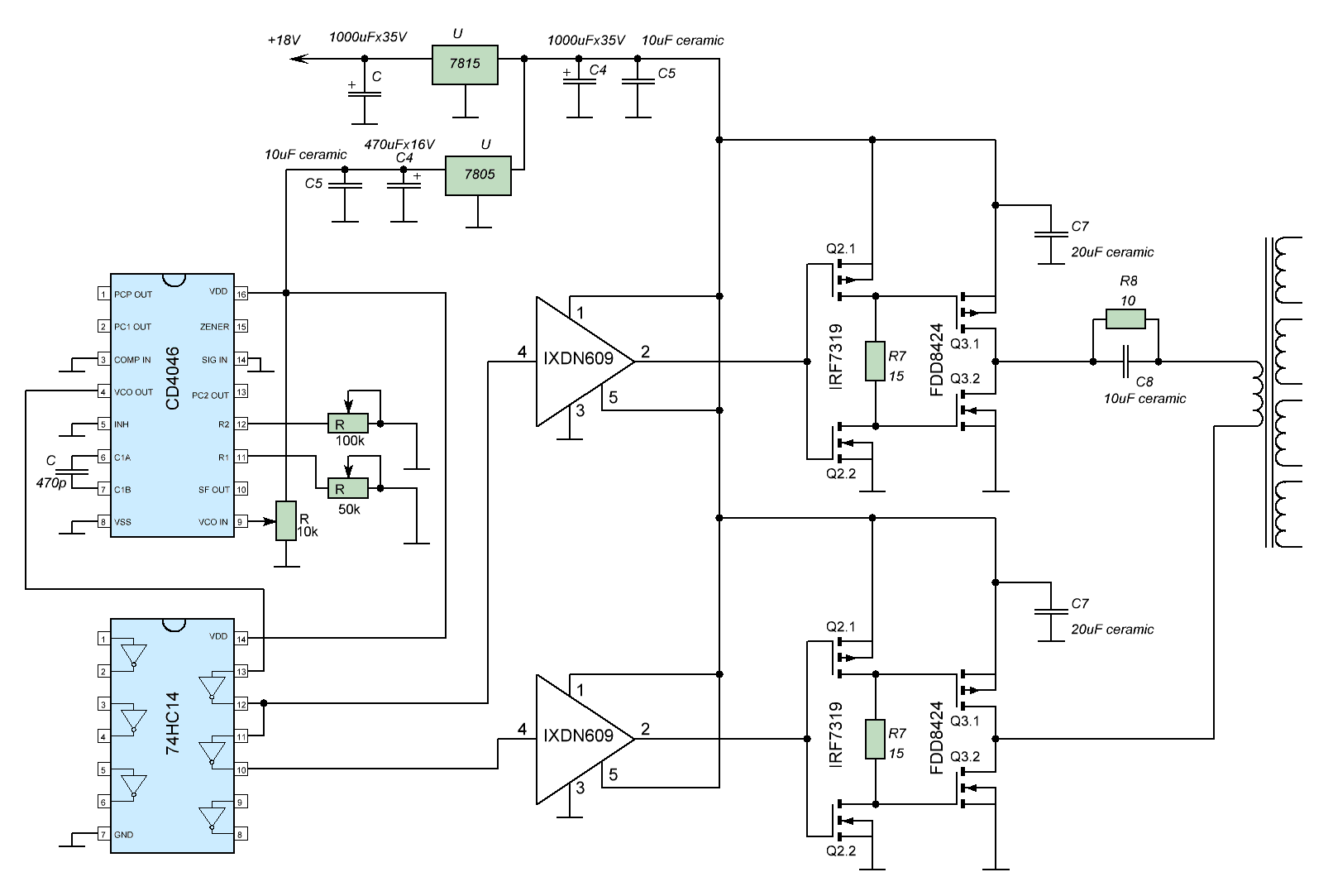 схемка вроде простая и понятная. спаял, запустил не подключая GDT, т.е. драйвер работал в холостую. между выходами драйверов был подключен осцилограф. и собсно им я тыкал много где. но GDT не был подключен ни когда.