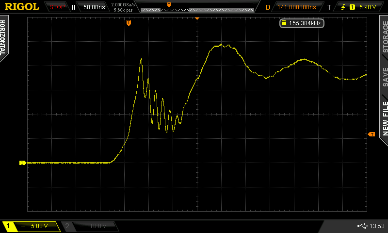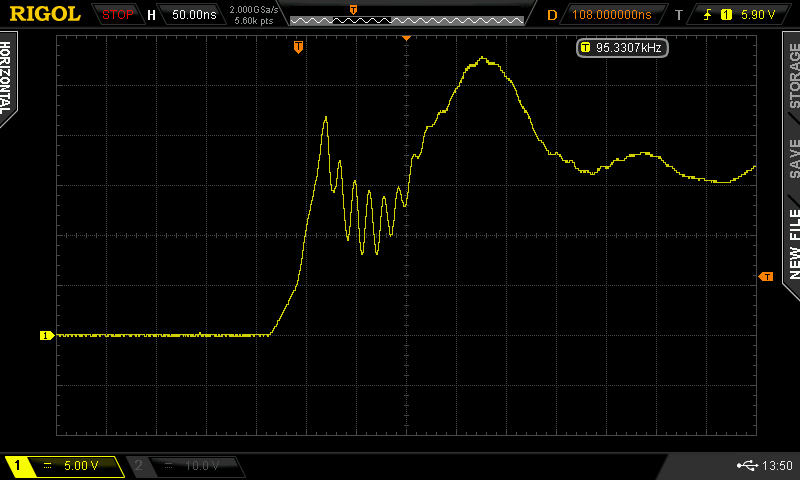 далее. с дросселем поигрался. но не особо все понятно. на осцилограмме тока через дроссель снятой с токового трансформатора в ситуации когда дросселю пора бы насыщаться линейный участок тока начинает замедлять рост. а должен бы по идее наоборот ускорять. выходит что дроссель насыщается а ток через него начинает медленнее расти. бред какой то.