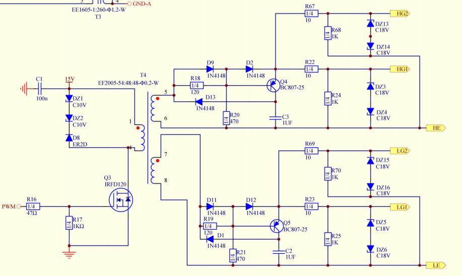 Набросал схему управления IGBT при помощи импульсного трансформатора (прикреплено ниже), но проблема в том что в симуляторе работает не так как по расчетах, напряжение на первичной обмотке гораздо меньше чем нужно, хотя уменьшив резистор R3 можна добитяся нужного напряжения. Я так думаю что метод вычислений неправильный (Если нужно расчет могу предоставить).