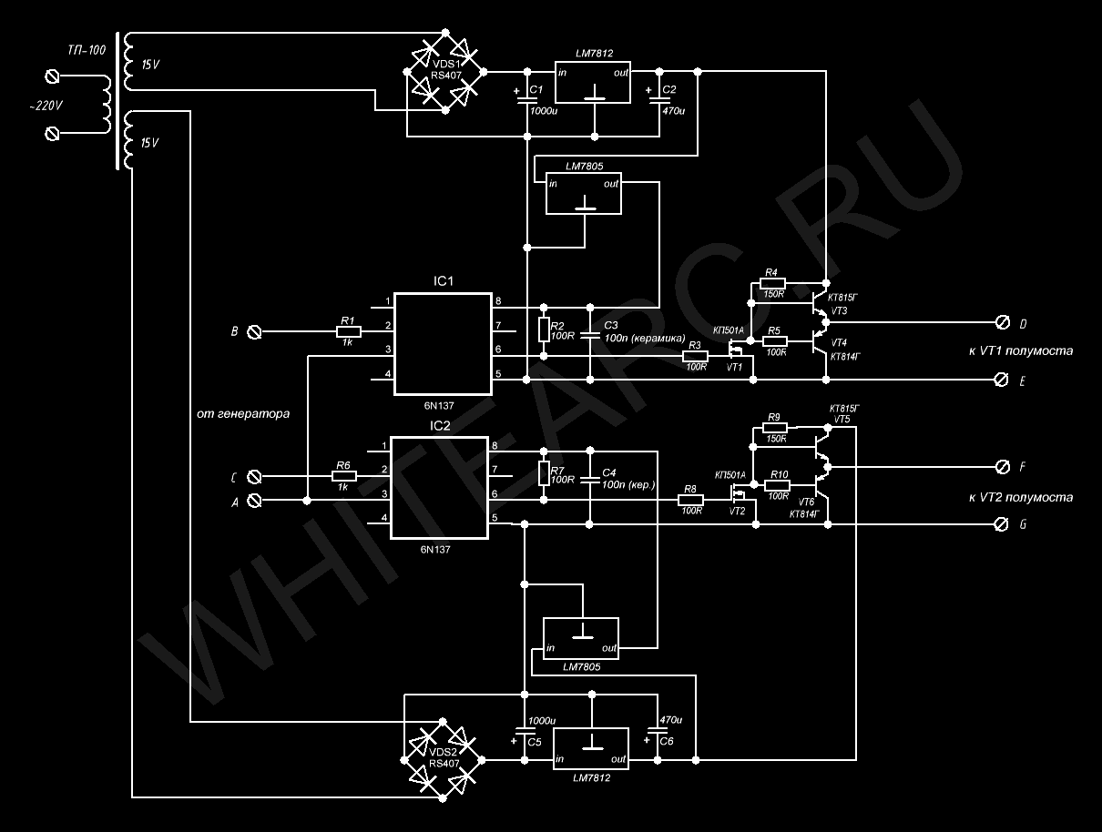 это всё вроде бы понятно,что не так с этим драйвером от bsvi,не подскажите? У вас есть какие то предположения? Тот что флаевский он встроен в генератор,я просто отсоединил питание и снял оптопары и подключил версию с этого сайта.Странно что автор безмолвствует,всё же его версия........MdAD-Q wrote:Для этого драйвера я набросал в симуляторе оба плеча, одно из которых работает в противофазеalekxandr68 wrote:Тогда почему на другой версии драйвера вот этодругая версия драйвера флай vd 5(+- 14v)