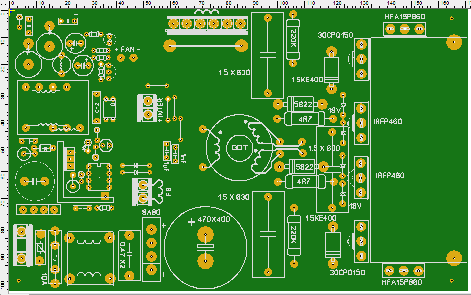 так...драйвера уцц37322 и 37321+мост из irf7105 на выход уццшек,раз уж я их купил,меньше шансов что уццха защелкнется...прерыватель вы итак знаете какой...полумост полный фарш с супрессорами 1,5ке400а шотки 30cpq150 фасты hfa15pb60 & irfp460 пленки по питанию само собой и эл.лит 1000мкф400в раз уж купил...все хочу на одной плате сделать...драйвер питать буду от иип на 12в 2а