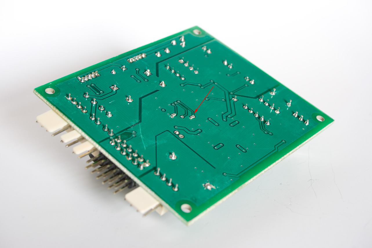 К счастью, исправить это просто. Достаточно допаять резистор между переходным отверстием и землей (показан красной стрелкой). Номинал резистора 1кОм, оптимально подходит размер 0603. (второй резистор допаивать не нужно, он для теста)