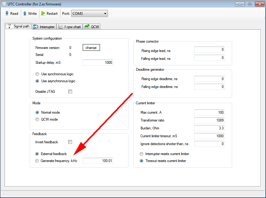 Добавил генератор тестового сигнала обратной связи. Его можно использовать вместо внешнего генератора при настройке, при этом он запускается начинается синхронно с прерывателем и из-за этого, его удобно смотреть на осциллографе - картинка не плавает. Можно использовать как внутренний, так и внешний прерыватель.