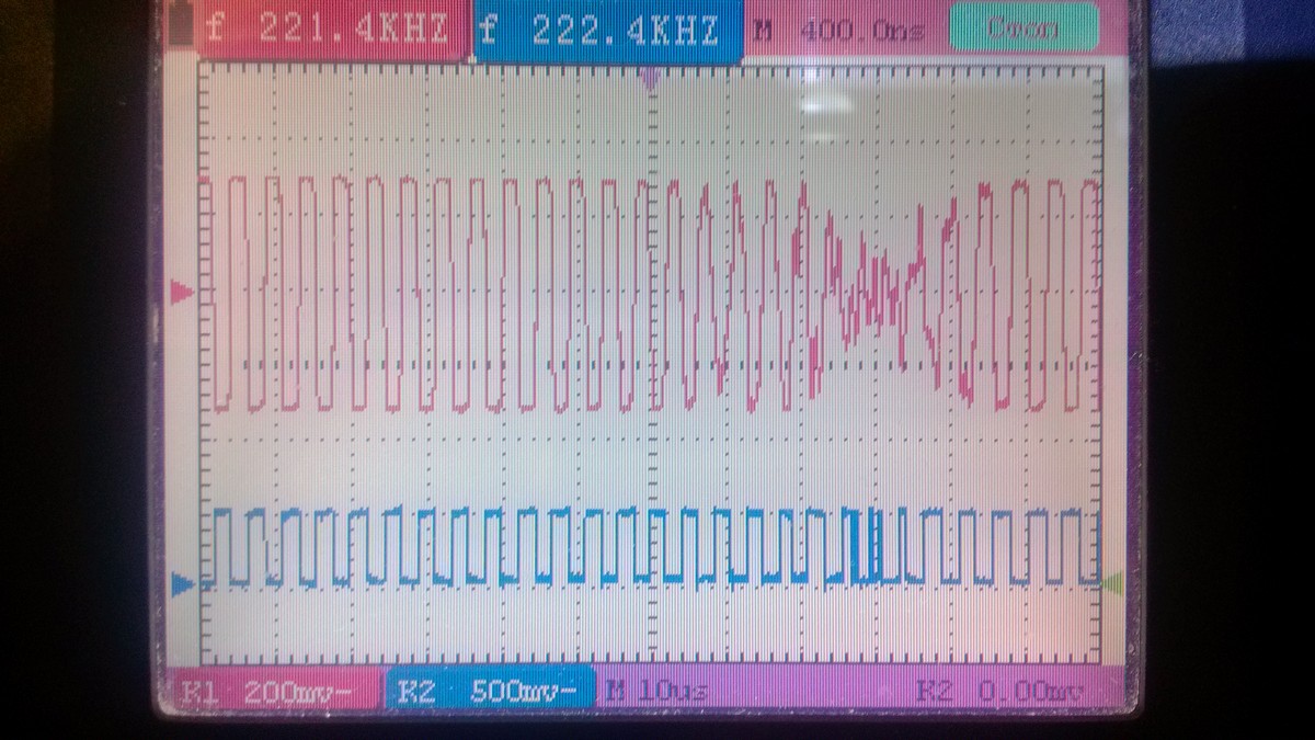 - Красный -Сигнал ОС после триггера шмитта, синий - сигнал на выходе драйвера.