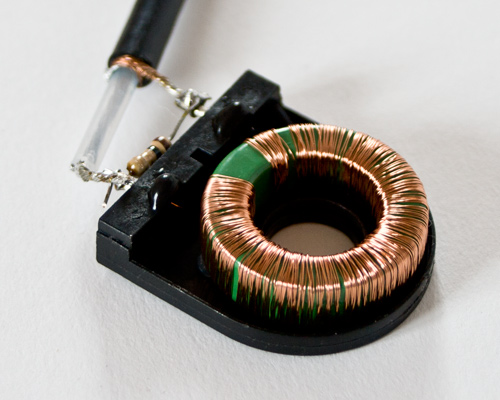 Самое интересное, что имеет значение полярность подключения ее к выводам. Это объясняется тем, что на плате теслы есть еще одни хоть небольшой, но виток. И перекидывая выводы можно его включать в фазе или в противофазе.