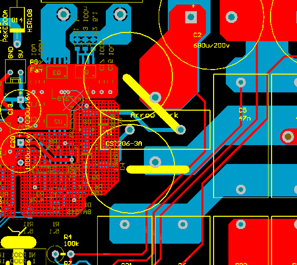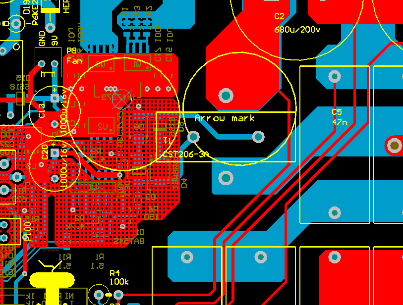 И еще немного поработал. Освободил место для своих токовых трансформаторов. Я подумал что ложить трансформаторы плашмя - не очень то идея. Образуется виток, который может от первички ловить наводки. Хотя, это очень спорный момент - нужно обмозговать. Ну, в любом случае на этой плате можно положить трансформаторы хоть плашмя хоть на бок. Если ставить трансформатор на ребро, то таких витков получается много, хотя они и меньше и вроде-бы как должны взаимокомпенсироваться.