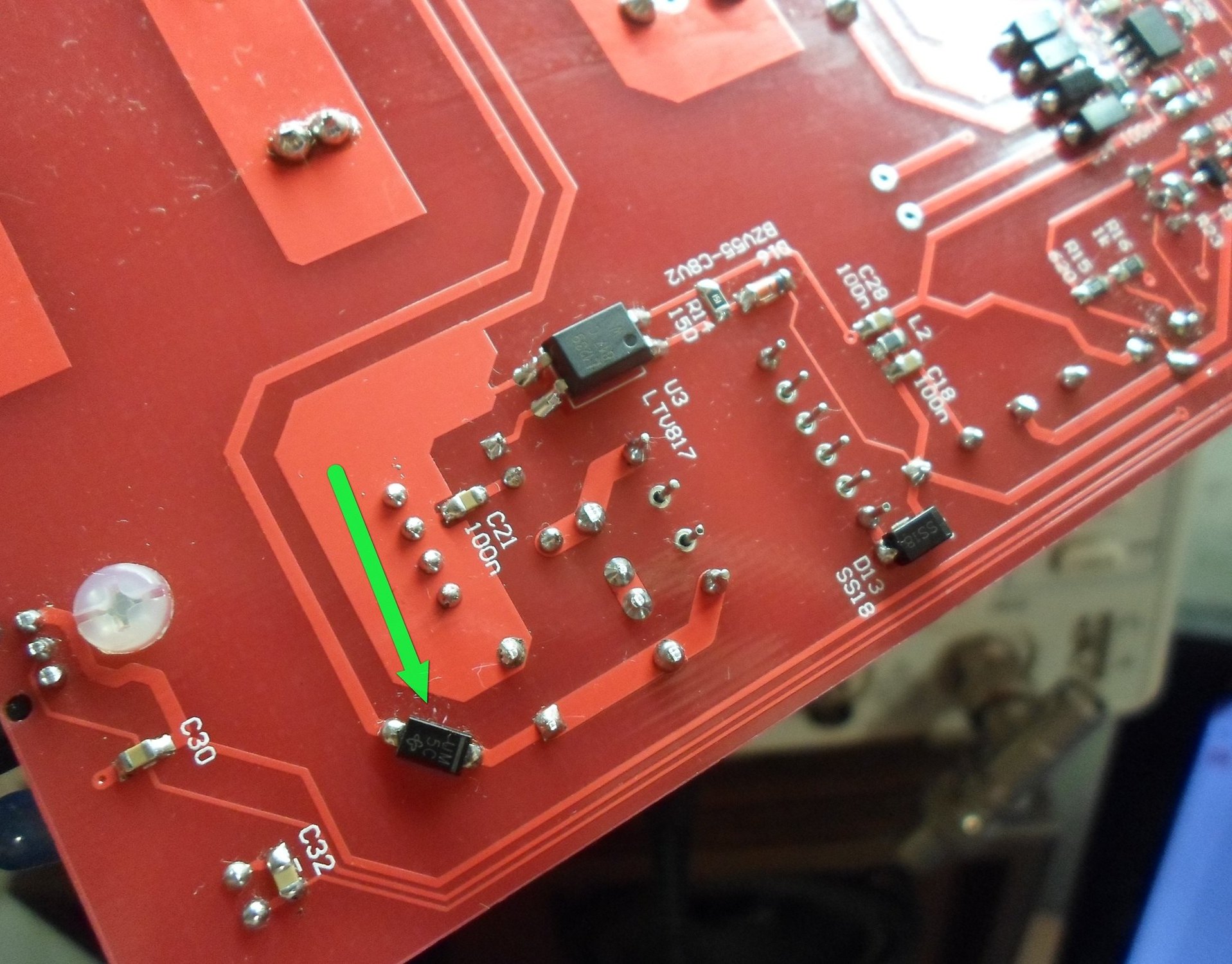 Дабы отвязать цепь питальника от основной схемы — можно поставить диод вот сюда. Подойдет любой ultrafast, в моем случае стоит US1M.
