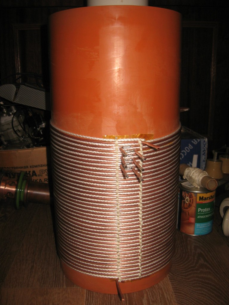 Начнём с первой. Для каркаса первички была куплена труба для канализации диаметром 25см. И медный одножильный провод диаметром 4мм. Сняв с него изоляцию, я намотал 35 витков, с отводом от верхних 6 витков. Больше, как правило, не нужно (опыт показал, что дальнейшую настройку лучше проводить, изменяя ёмкость ММС). Вот так оно начиналось...