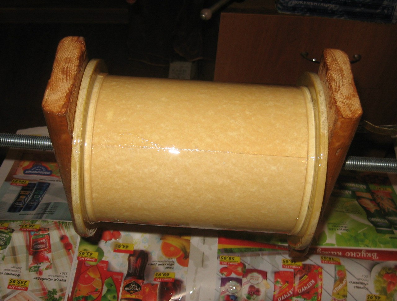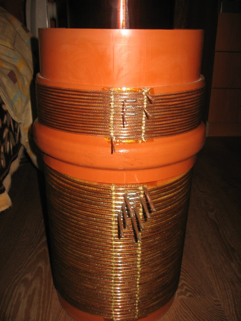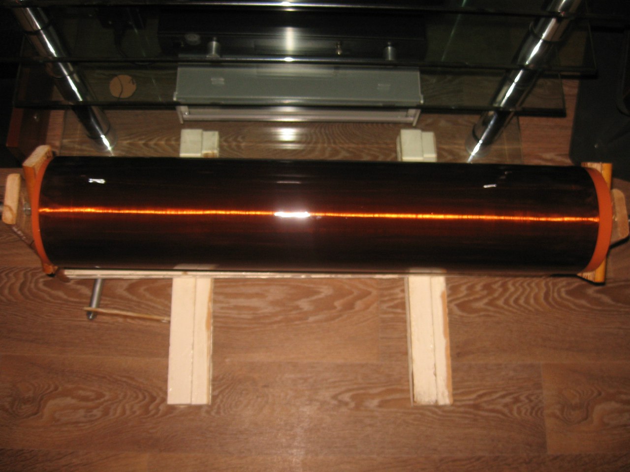 Совсем забыл упомянуть вторичку трансформатора Тесла. Она была намотана на трубе 160мм диаметром и длиной 80см. Собсвенно, показанное в предыдущих фотках устройство для намотки - собиралось именно для неё. Вторичка была покрыта эпоксидкой.