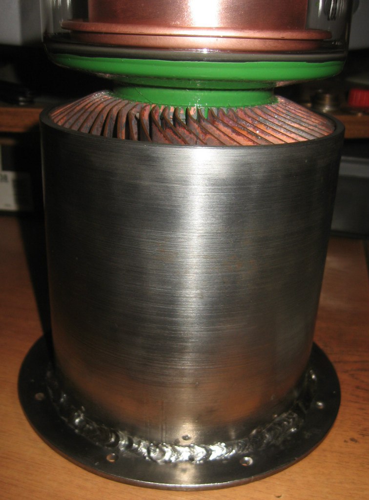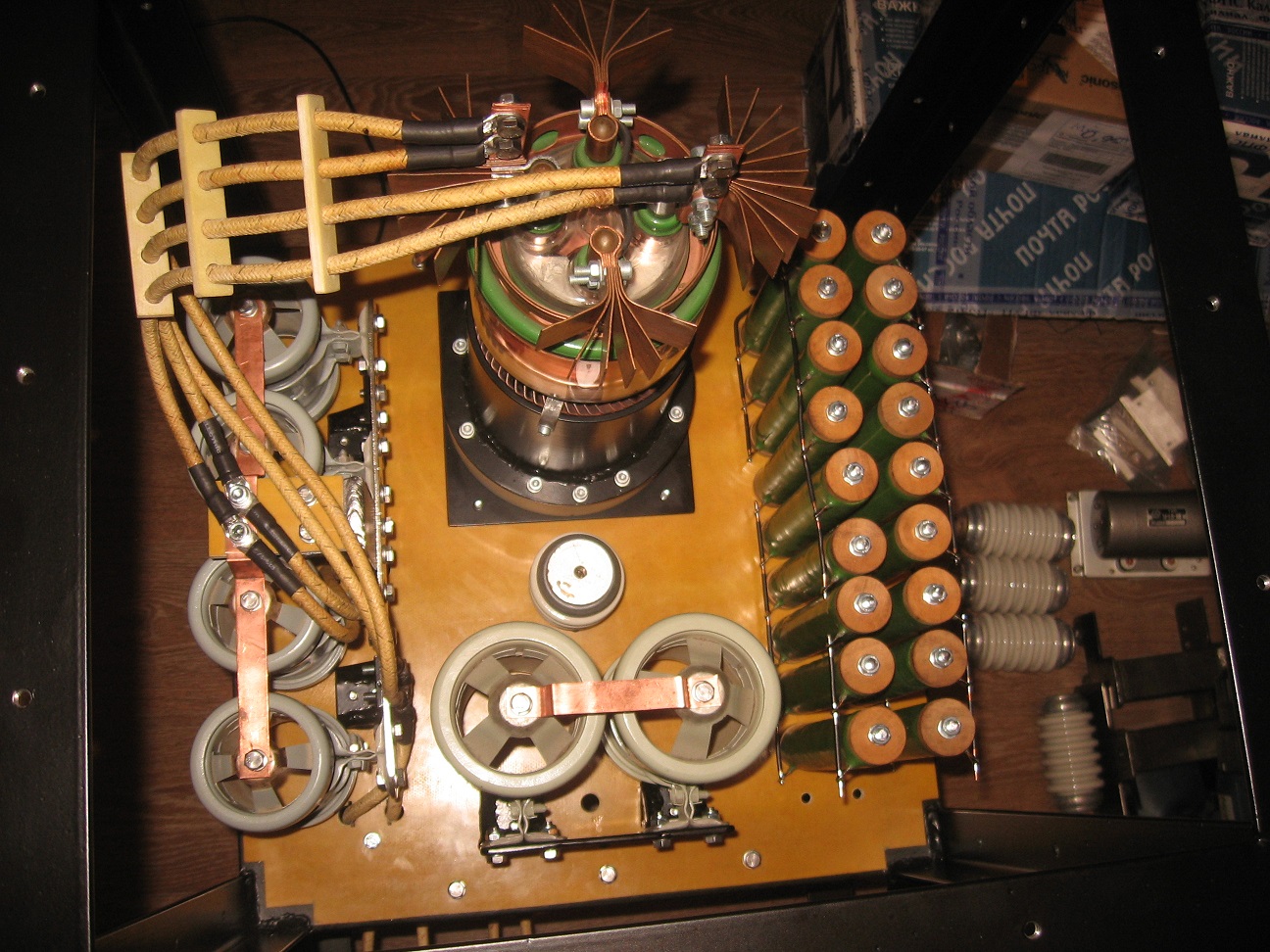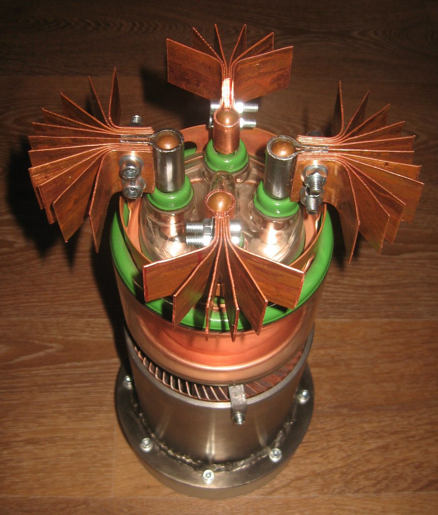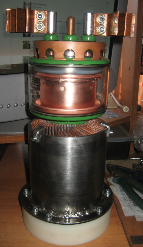 Итак, катушка Тесла на мощном генераторном тетроде воздушного охлаждения ГУ-39Б-1. Лампа сама по себе довольно нетривиальная в использовании - ток накала 100А при напряжении накала 6,3В, это более 600вт только на один накал! Воздушное охлаждение анода не менее 600 кубометров в час, охлаждения требуют также и выводы катода и сеток. Лишь при поданном накальном напряжении и включенном обдуве анода она уже представляет из себя нехилую печку, чего уж говорить про номинальный режим. Впрочем, это всё можно прочесть в даташите к лампе. А теперь вернёмся к генератору.