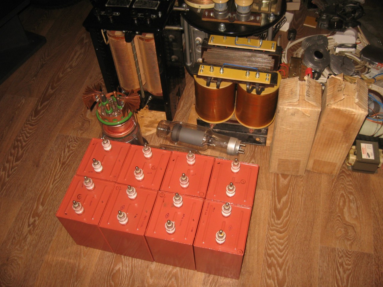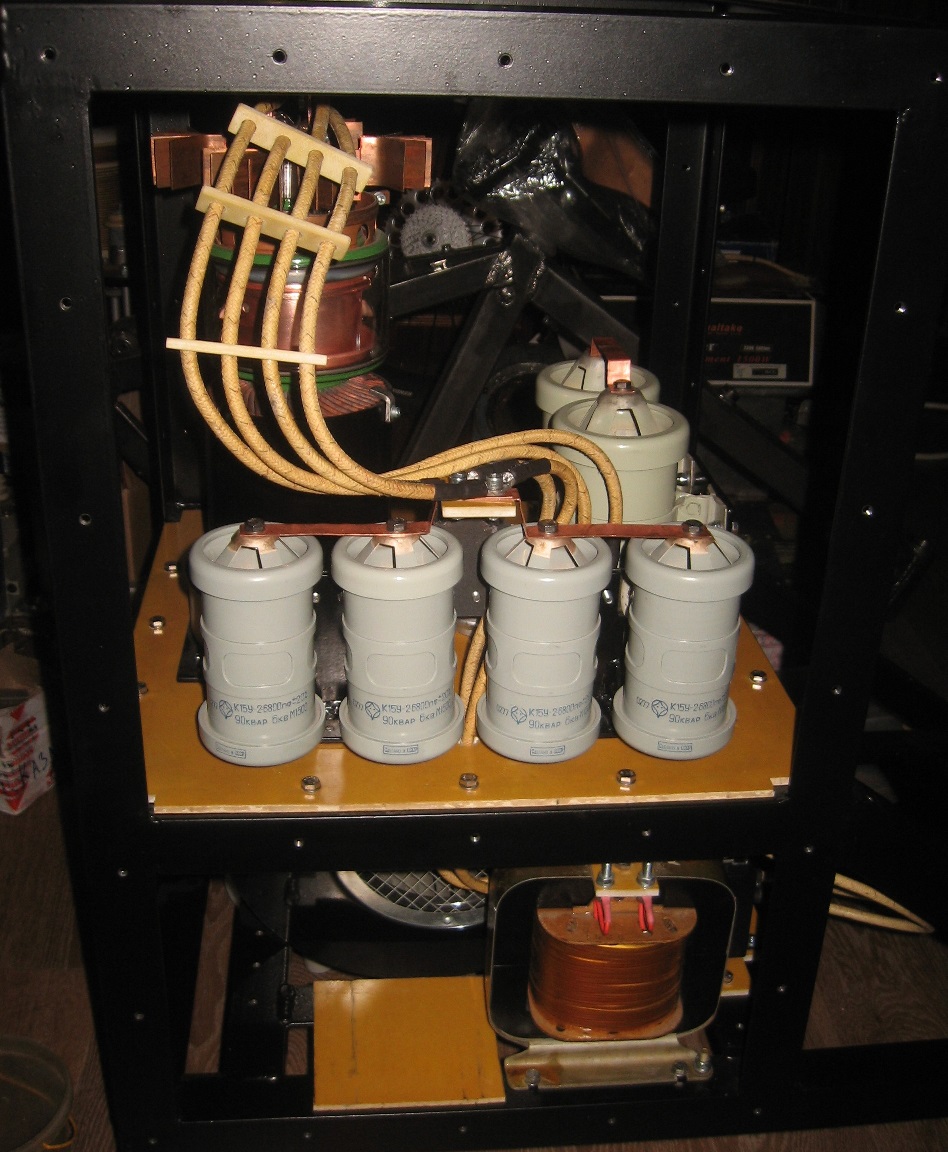 Вернёмся теперь к источнику питания. Схема катушки, можно сказать, классическая. А значит, у неё имеется т.н. шифтер. Для последнего нужен конденсатор достаточной ёмкости под довольно высокое напряжение. Поиски заняли много времени, и наконец, были куплены восемь конденсаторов с комбинированным диэлектриком - к75-29а 1мкф 16кв. Каждый конденсатор весит около 8кг, а всего их 8 штук... Тяжело.