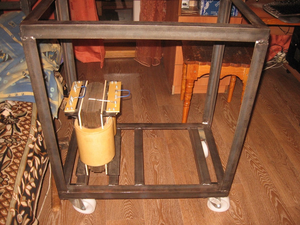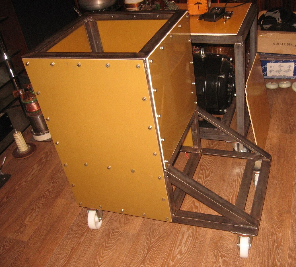 Ну и последний пост, которым я бы завершил описание своей конструкции. Генератор решено было разделить на два модуля - блок питания (он же пульт управления), и блок генератора. Для каждого из блоков были сварены каркасы из стального уголка 40мм толщиной 4мм. Блоки установлены на колёса. Блоки будут облицованы панелями из стеклотекстолита толщиной 5мм. Сами каркасы - краситься порошковой краской (генераторный блок уже покрашен)