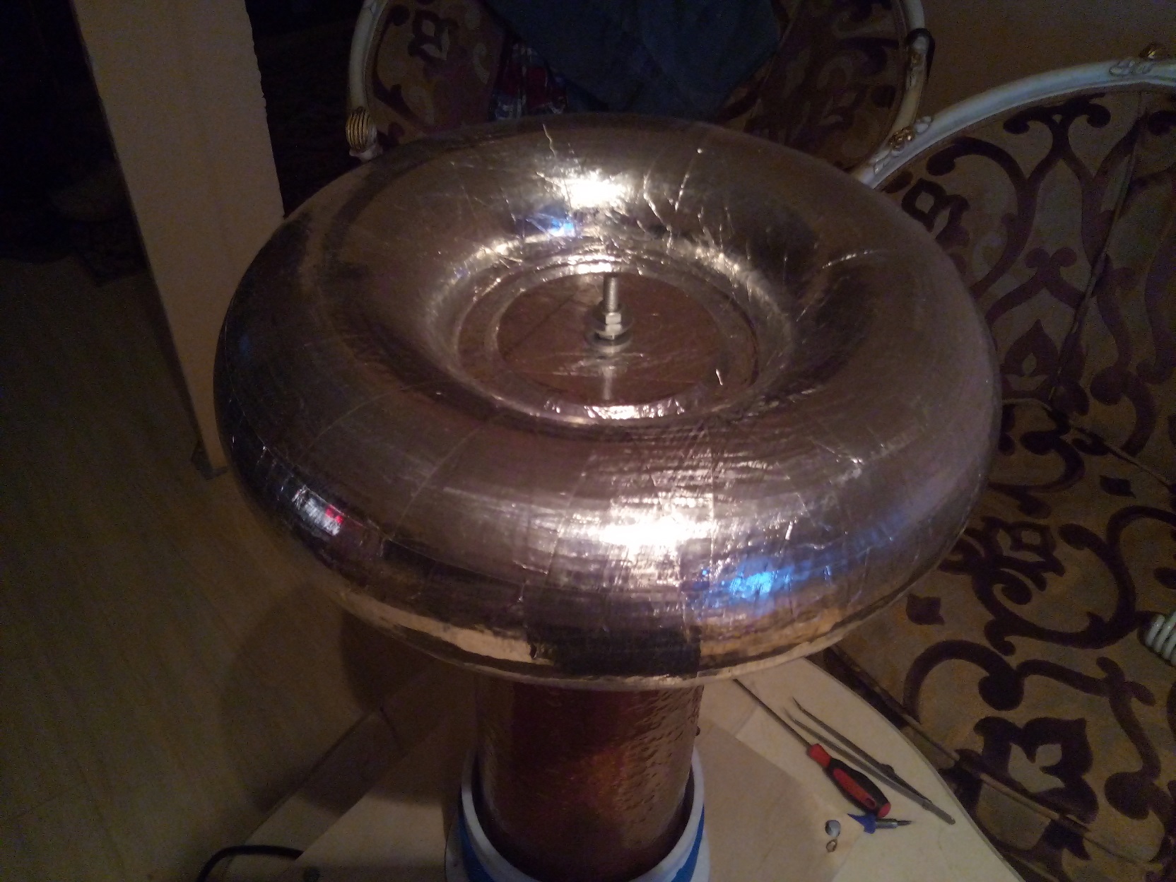 Тор не стал делать из гофротрубы, был напечатан из 6 частей на 3д принтере, склеен и обклеен алюминивой фольгой-скотчем, наружный диаметр бублика 270мм, диаметр "трубы" 80мм