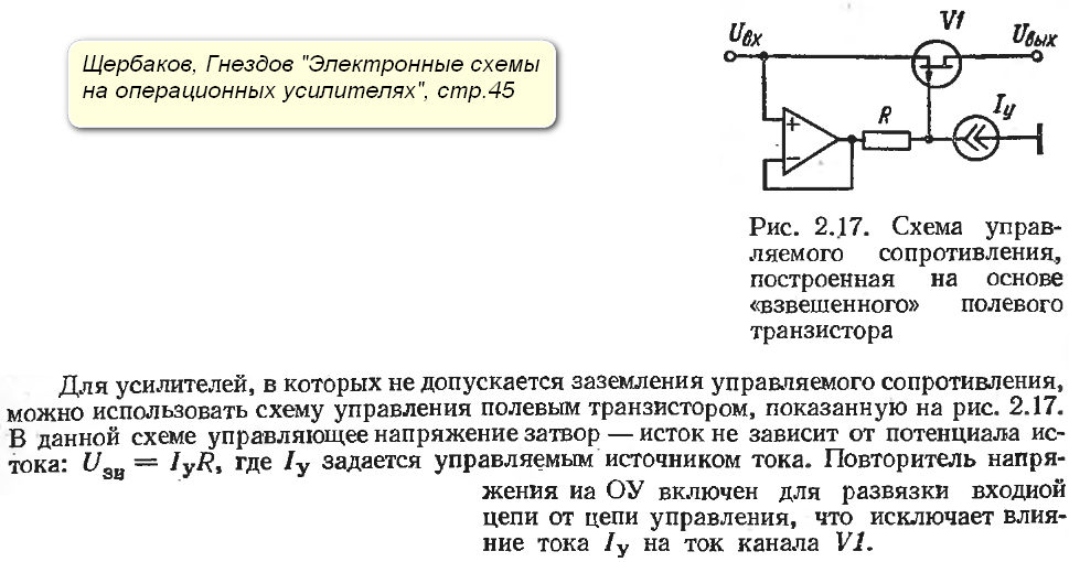 Есть у Щербакова и Грездова в справочнике "Аналоговые схемы на операционных усилителях" описание управляемого сопротивления на полевиках (стр. 44-45). Но я довольно смутно в этом понимаю. Например,