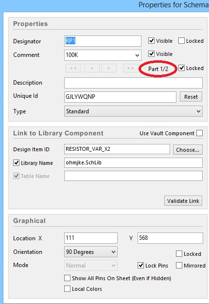 Есть *.schdoc файл со схемой одного канала УНЧ, где один из элементов - сдвоенный потенциометр. На схеме размещена только одна его половина ("Part").