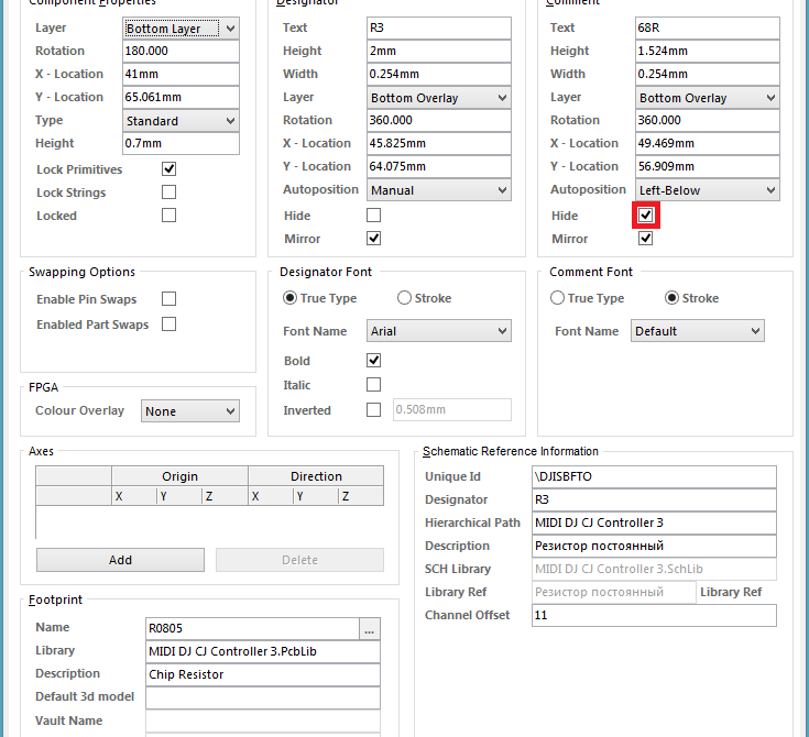 Вопрос о создании футпринта. В редакторе PcbLib делаем Place->String потом жмем свойства и полю Text ставим значение .Designator. Делаем все в слое Top Assay. Текст по сравнению с самим футпринтом получается очень большой поэтому когда происходить автопанаромирование чип резистор на фоне надписи получается очень маленьким(что есть некрасиво). Такой эффект наблюдается в окне просмотра футпринтов в SchLib. Выключение отображения слоя Top Assay не помагает. Надпись при этом пропадает но автопанаромоирование все равно происходит с учетом габаритов текста который в разы больше самого футпринта. Как с этим бороться?
